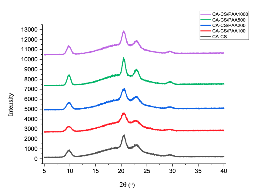 The CA-CS and modified CA-CS membrane samples were characterized using an X-ray diffractometer Rigaku MiniFlex 600 diffractometer with Cu Kα radiation (λ = 1.5406 Å), operated at 40 kV and 30 mA. The diffractogram peaks were recorded at 2θ range of 5° - 40° with a step size of 0.02° and a scan rate of 2°/min.