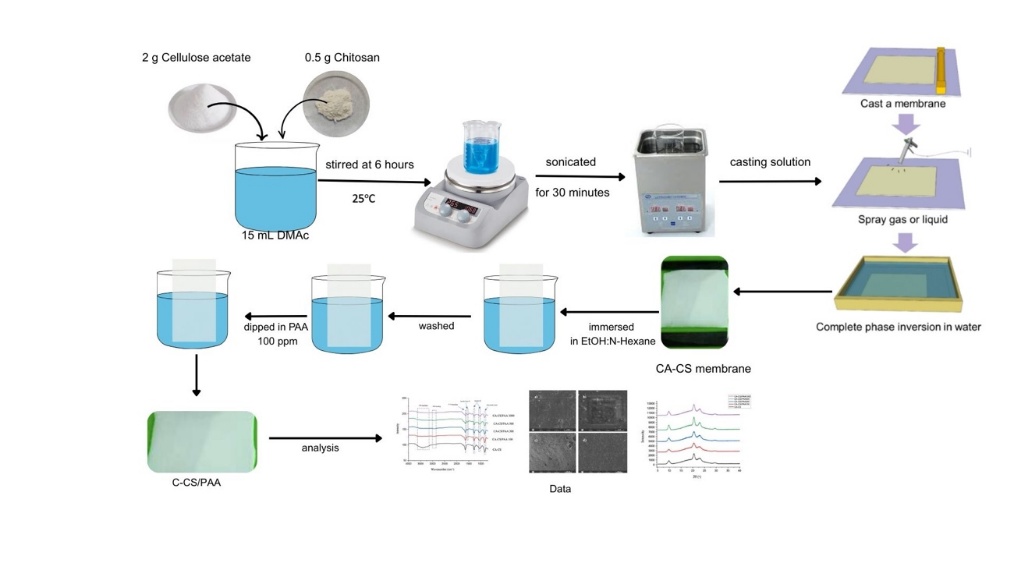 The membrane was fabricated using the NIPS (Non-Induced Phase Separation) phase inversion method [25]. Initially, 2 g of cellulose acetate powder was dissolved in 12 mL of DMAc solvent. Then, 0.5 g of chitosan was mixed into the cellulose acetate solution and stirred at 300 rpm for 6 h at room temperature to form a gel. The gel formed was cast onto a flat glass plate (20×10×0.5 cm3) and left for 2 min until air bubbles disappeared. Finally, the resulting mold was placed in a coagulation bath containing deionized water to form a membrane. The membrane was removed and dried in an oven at 50 °C for 14 h.