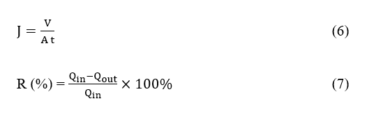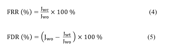 where FRR denotes Flux Recovery Ratio, FDR was Flux Decline Ratio, Jwo was initial flux, Jwt was the flux at the time, Jwc was flux after cleaning [32].