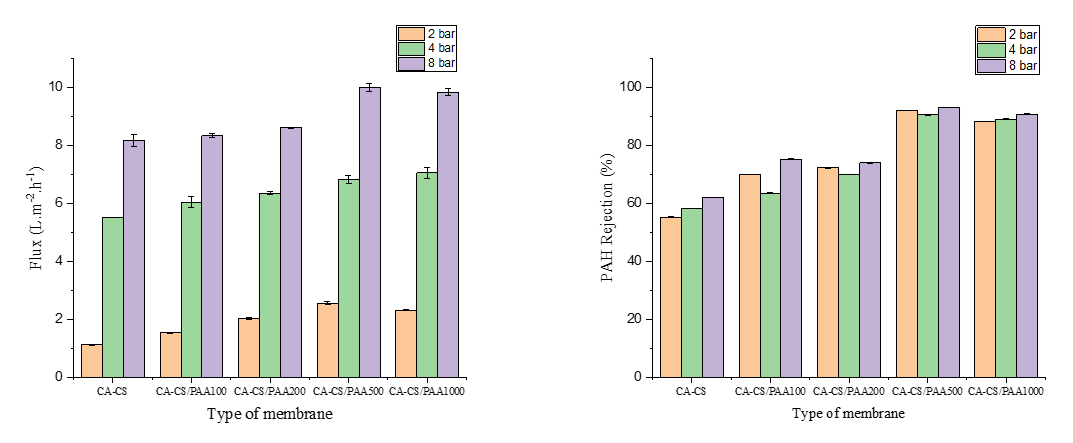 The separation of Polycyclic Aromatic Hydrocarbons (PAHs) from wastewater is essential due to its mutagenic and carcinogenic properties. Cellulose acetate-chitosan membranes (CA-CS) coated with polyelectrolyte complex poly(acrylic-acid) (PAA) at various concentrations (100, 200, 500 and 1,000 ppm) have been synthesized to improve the separation performance of PAHs. Fourier Transform Infrared (FTIR) characterization confirms the formation of polyelectrolyte complex PAA-CS through NH₃⁺/COO⁻ ion pairs (strengthening of the bands 1,560 - 1,600 and 1,410 cm−1 and attenuation of C=O at 1,730 cm−1), while Scanning Electron Microscopy (SEM) analysis and surface contours show changes from a nodular surface of CA-CS membrane to a more homogeneous layer during the coating process. X-Ray diffraction patterns indicate structural regularity in the composition. The water contact angle decreased from 65.56° in CA-CS to 36.34° after PAA coating at 500 ppm, and the swelling index increased from 48.24% to 73.95% confirming the membrane’s hydrophilic nature after coating. Mechanically, tensile strength increased with increasing PAA concentration, due to physical cross-linking via hydrogen bonds that solidified the network. Membrane performance test showed that permeate flux and PAHs rejection increased after CA-CS coating and achieved the best performance at 500 ppm PAA across all operating pressures (2 - 8 bar) with an optimum flux of 11.56 L·m−2·h−1 and optimum PAHs rejection of > 90%. In addition, the CA-CS/PAA 500 membrane also showed the best antifouling properties with the lowest Flux Decline Ratio (FDR) of 20% and the highest Flux Recovery Ratio (FRR) of 78%. Ultimately, poly(acrylic acid)-coated cellulose acetate-chitosan biopolymer-based membranes have great potential for continuously and sustainably separating PAH pollutants from wastewater.