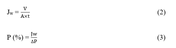 where, Jw denotes water flux (L·m−2·h−1), V is the permeate volume (L), A is the effective membrane area (m²), t is the permeation time (h), and P is water permeability (L·m−2·h−1·bar−1).