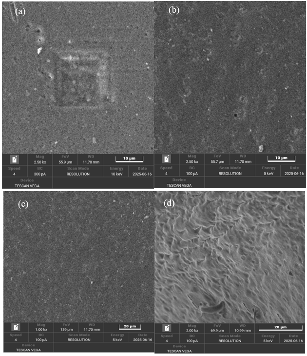Even after coating with low PAA concentrations, morphological changes remained limited. The coating was not entirely continuous, so the CA-CS nodular pattern remained dominant. The report by [46] also showed that adding PAA at an initial level began to alter the topography but did not yet form a homogeneous film. At intermediate concentration (PAA 500 ppm), the surface appears more uniform/compact with a wavy texture, indicating a continuous layer over the sponge substructure. This is consistent with a more mature PEC (complex polyelectrolyte) scenario (NH₃⁺/COO⁻ ionic bonds and H-bond networks) that densifies the surface and stabilizes the substructure [42]. Similar effects have been widely reported for CS-PAA-based membranes, where the addition of PAA alters the morphology and improves the robustness/water resistance [33,47,48]. At the PAA concentration of 1,000 ppm, the surface appears very smooth and homogeneous at the 20 µm scale, with few topographic features. This indicates over-coating/over-plasticization (the PAA-rich layer covers the CA-CS micro-features) and the possible shift of surface pores to the nanoscale [49]. This observation is consistent with the study by Regenspurg et al. [50], which reported that excessive PAA content enhances PEC formation, leading to a smoother, denser surface morphology while suppressing macrovoid growth. Similarly, another study by Baig et al. [24] observed that high PAA concentrations strengthen interchain bonding, resulting in improved surface uniformity.