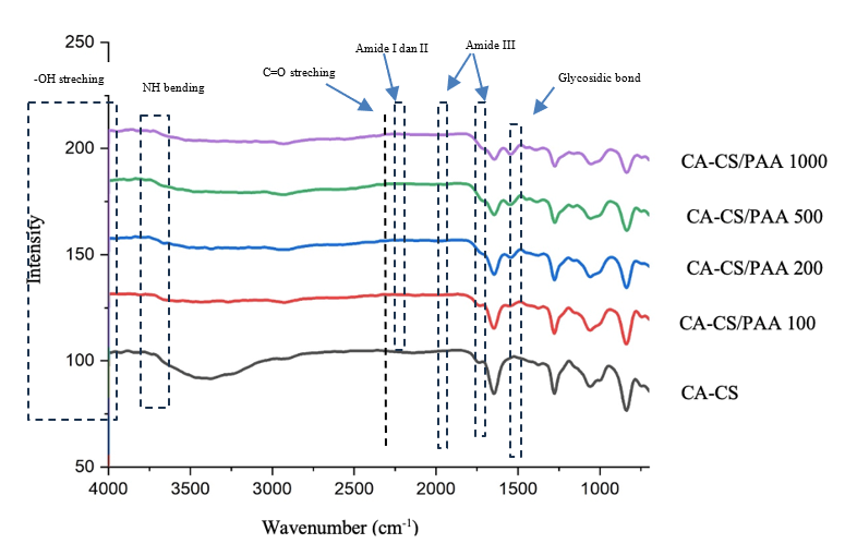 Figure 2 shows the FTIR spectra of the pure CA-CS membrane and after PAA coating. In CA-CS membrane, the spectrum shows a broad characteristic O–H band at around 3,350 cm⁻¹ [33], aliphatic C–H at 2,920 cm⁻¹, sharp C=O cellulose acetate ester at 1,740 - 1,745 cm⁻¹, and Amide I/II bands of chitosan at 1,655 and 1,550 - 1,560 cm⁻¹, respectively [34-36]. The broad absorption band at 3,400 - 3,500 cm⁻¹ corresponds to the O–H stretching vibration. The intensity of this band slightly increases and shows a minor broadening trend with increasing PAA coating cycles, indicating enhanced hydrogen bonding and surface hydrophilicity. The polysaccharide fingerprint region appears at 1,245 - 1,050 cm⁻¹ (C–O/C–O–C) and glycosidic bonds at 895 cm⁻¹ glycosidic [37]. After PAA coating, a new band appears at 1,550 - 1,655 cm⁻¹. This band originates from the overlap of the Amide I and II region of chitosan (N–H bending/C–N stretching) with the asymmetric carboxylate stretching of the –COO⁻ group [25]. At the same time, the C=O band of the free carboxylic acid in 1,710 - 1,730 cm⁻¹ decreases in intensity and can shift slightly to lower wavenumbers. This indicates that some of the –COOH groups change to –COO⁻ due to acid–base interactions with the –NH₃⁺ group of chitosan under acidic conditions [38]. The symmetric carboxylate band (amide III) at 1,410 - 1,200 cm⁻¹ also increases, and the broad O–H/N–H band (3,200 - 3,500 cm⁻¹) broadens, indicating a stronger hydrogen bonding network [24].