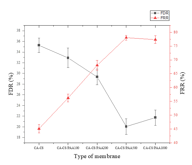 This fact is confirmed by measurements of the percentage of the Flux Decline Ratio (FDR) and the Flux Recovery Ratio (FRR) for all membrane types. Based on the measurement results shown in Figure 12, the FDR percentage of the CA-CS/PAA 500 membrane is the lowest among the membranes at 20%. This is followed by the highest FRR percentage of the CA-CS/PAA 500 membrane at 78%, indicating that the membrane can recover the best flux because it has the highest anti-fouling properties [21,31]. This performance surpasses several previously reported polymeric membranes. For instance, a study by Ounifi [25] reported a cellulose acetate-poly(acrylic acid) (CA-PAA) blend membrane with an FRR of approximately 65%, which was primarily attributed to the hydrophilic character of PAA but still limited by the absence of strong interfacial hydrogen bonding. Similarly, another study by Guo [62] observed that surface-coated polyamide membranes modified with dopamine–MOF structures achieved FRR values of 70% - 75%, indicating partial, but not complete, flux recovery after fouling. In comparison, the higher FRR in the CA-CS/PAA 500 membrane indicates more efficient mitigation of irreversible fouling, likely due to synergistic hydrogen bonding and ionic interactions between PAA and chitosan, which enhance its hydrophilicity.