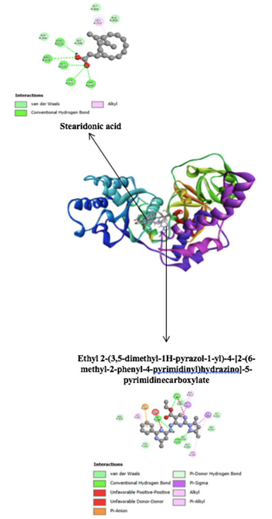 Figure 4 2D and 3D interaction of two ethanolic compounds at the active site of hyluronidase.