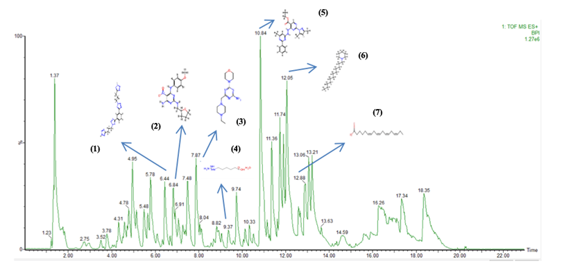 The bioactive constituents of the samples were analyzed using a high-performance liquid chromatography–mass spectrometry (LC–MS/MS) system. Chromatographic separation was performed on an ACQUITY UPLC® H-Class System (Waters, USA) coupled to a Xevo G2-S QTof mass spectrometer (Waters, USA). The mobile phase consisted of water containing 5 mM ammonium formate (phase A) and acetonitrile with 0.05% formic acid (phase B), delivered at a flow rate of 0.2 mL/min under a step-gradient program for 23 min. The injection volume was 5 µL, with all samples pre-filtered through a 0.2 µm syringe filter prior to analysis. Mass spectrometric detection was performed using electrospray ionization (ESI) in positive ion mode. Data acquisition and subsequent processing were carried out using MassLynx software (version 4.1) [18,19].