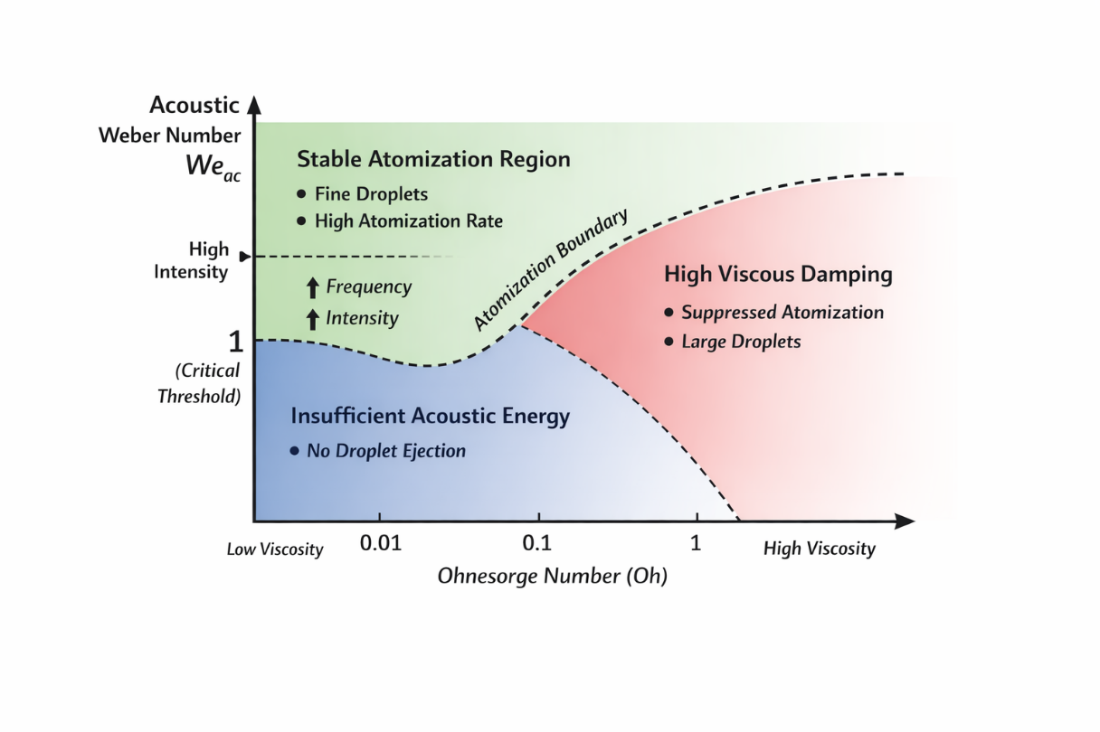 Ultrasonic atomizers represent a fundamentally distinct atomization regime dominated by acoustic/vibration excitation rather than bulk fluid velocity. In these systems, droplet formation is controlled primarily by ultrasonic frequency through capillary wave instability. The excitation frequency defines the capillary wavelength, which in turn determines droplet size, rendering traditional velocity-based Reynolds numbers less influential. Instead, the Ohnesorge number becomes critical in determining whether capillary waves can grow and eject droplets, as high viscosity suppresses wave amplification. This frequency-dominated mechanism enables ultrasonic atomizers to produce highly uniform micro- and submicron droplets under low-shear conditions. Overall, the table 1 illustrates that atomizer selection must be guided by an understanding of the dominant dimensionless parameters governing each atomization regime. While conventional atomizers are optimized through control of velocity-based Reynolds and Weber numbers, ultrasonic atomizers require frequency- and viscosity-focused optimization. This distinction explains both the advantages of ultrasonic atomizers in nanoparticle production and the challenges associated with their scale-up to industrial systems [42-47]