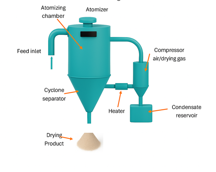 Different atomization technologies offer varying capabilities for particle-size reduction. Pressure nozzles can produce relatively fine droplets by increasing feed pressure, yet they are limited by nozzle erosion, feed viscosity thresholds, and the risk of shear-induced degradation. Two-fluid nozzles generate finer droplets by using high-velocity gas to atomize the liquid, making them popular in laboratories for producing microscale powders. Rotary atomizers, while robust and suitable for high throughput, generally produce larger droplets and are less effective for achieving fine particles unless operated at very high disk speeds. In contrast, ultrasonic and vibrating-mesh atomizers excel in producing monodisperse microdroplets through controlled vibrational energy, enabling the formation of submicron or nanoscale powders when combined with optimized formulations. These advanced atomizers are therefore particularly relevant for high-value natural products, nanoparticle encapsulation, and sensitive bio-actives compound.