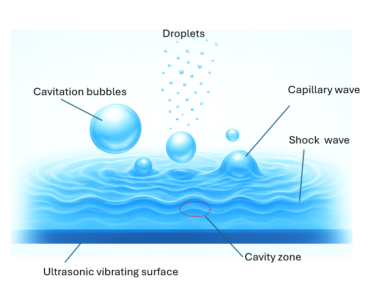 Existing studies has focused to understanding the performance of ultrasonic atomizers which play an important role to develop of spray dryer techniques by offering a more efficient and effective way of producing fine and uniform droplets from a liquid feed. Ultrasonic atomization is another common process, which utilizes a piezoelectric actuator to generate droplets. Two main phenomena have been proposed such as: cavitation and capillary waves. The interaction between shocks wave which is generated by cavitation and capillary waves is quite complex (Figure 3). The formation of droplets in ultrasonic atomization begins when a high-frequency vibrating surface transmits ultrasonic energy into the liquid, generating rapidly oscillating pressure fields that create capillary waves on the liquid surface. As the vibration intensity increases, these waves grow in amplitude and become unstable, while cavitation bubbles form within the liquid during low-pressure cycles. When these cavitation bubbles violently collapse, they release localized shock waves characterized by very high pressure over extremely short time scales. These shock waves propagate toward the liquid surface, intensifying surface disturbances and thinning the crests of the capillary waves. The combined effect of surface wave instability and the impulsive pressure from shock waves causes the wave crests to rupture, ejecting small liquid fragments into the air, which subsequently break up into fine atomized droplets [29-32].