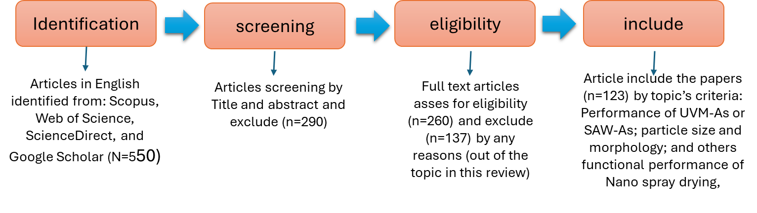 The literature selection process for this review was conducted following the general principles of the PRISMA (Preferred Reporting Items for Systematic Reviews and Meta-Analyses) guidelines to ensure transparency, reproducibility, and methodological rigor. A systematic literature search was conducted to identify and selection peer-reviewed articles related to ultrasonic atomizers and their application in spray drying for nanoparticle production. Major scientific databases, including Scopus, Web of Science, ScienceDirect, and Google Scholar, were explored to obtain relevant publications. Keywords and combinations of keywords used in the search included “ultrasonic vibrating mesh atomizer”, “vibrating mesh spray drying”, “ultrasonic atomization”, “nano spray drying”, “piezoelectric atomizer”, and “particle size control in spray drying”. The search was limited to articles published in English to ensure consistency and accuracy in technical interpretation. 550 papers were identified through keyword-based searches related to this review topic. This selection was firstly identified in their abstract and title.