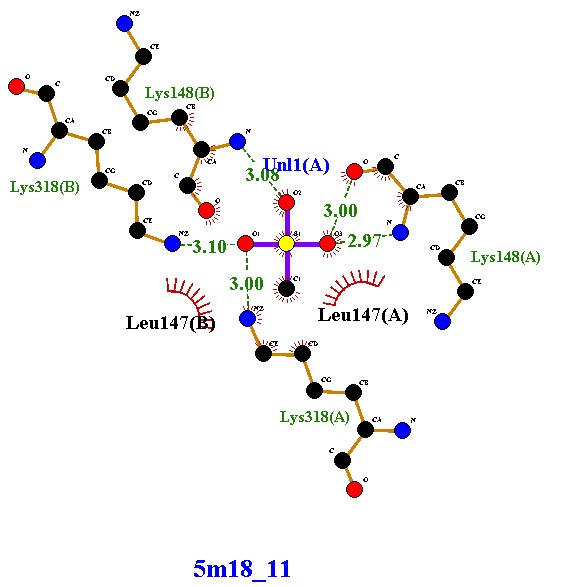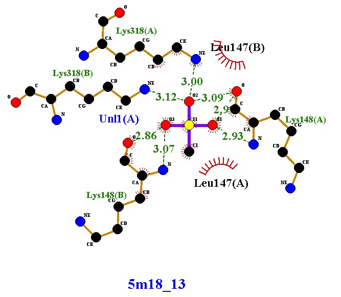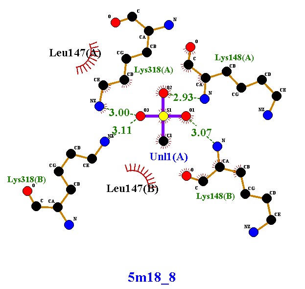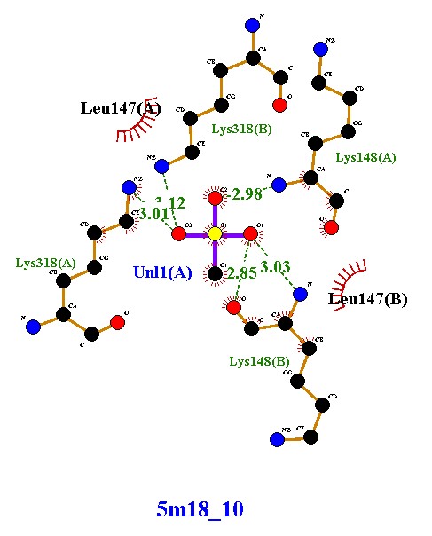 Forms five hydrogen bonds with Lys318(A), Lys318(B), Lys148(A), Lys148(B), and Uni1(A), with bond lengths ranging 2.85 - 3.12 Å (within the optimal range). Shows hydrophobic interactions with Leu147(A) and Leu147(B), contributing to additional stability. Interactions involve both protein chains (A and B), similar to compound 5m18_8, but here the ligand forms |