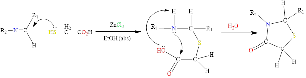 A mixture of equivalent moles of one of Schiffʼs bases (1 - 4) (mole 0.002) with (mole 0.002) (0.18 g) of thioglycolic acid was dissolved in (25 mL) of absolute ethanol, then (0.01 mole) (1.36) was added to it g) of anhydrous zinc chloride. The reaction mixture was reflux for (8 h), after which the mixture was cooled, then the formed precipitate was filtered and washed with a solution of (3%) sodium bicarbonate, then recrystallized from (dioxane - water). physical characteristics and spectral properties are shown in Tables 2.