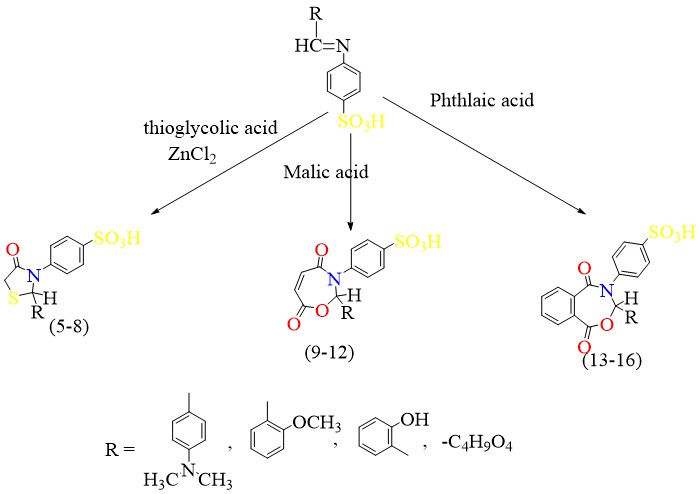 Heterocyclic compounds represent one of the most important classes in organic chemistry due to their wide range of biological and pharmacological activities. In this study, new Schiff bases were synthesized through the condensation of benzaldehyde derivatives with para-aminosulfonic acid. These intermediates were subsequently cyclized to obtain four-, five-, and seven-membered heterocyclic systems, including thiazolidine, oxazepine, and benzooxazepine derivatives. The structures of the synthesized compounds were confirmed using elemental analyses and spectral techniques (IR, ¹H-NMR, and ¹³C-NMR). The antimicrobial activity of the prepared compounds was evaluated against Gram-positive and Gram-negative bacterial strains, as well as yeast species. Results revealed that compounds 8, 10, 11, and 13 displayed notable inhibitory effects, particularly at higher concentrations, with compound 13 showing the strongest biological activity. Furthermore, molecular docking simulations demonstrated favorable binding interactions of selected compounds with the active sites of target proteins, indicating their potential as promising leads for drug development.