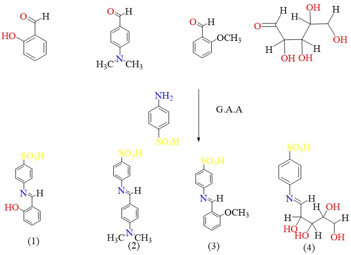 mixed (0.01 mol) of one of the benzaldehyde substitutes with (20 mL) of absolute ethanol, then (0.01 mol) para-sulfanilic acid and some drops of glacial acetic acid are added to it, the mixture reflux for 2 - 4 h, then it is cooled for sedimentation and crushed ice is added. The precipitate was filtered, then recrystallized with ethanol. Some physical constants and spectral properties are shown in Tables 1 - 4.