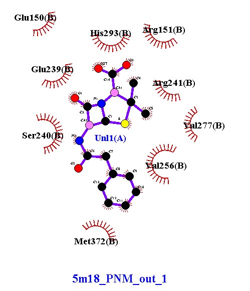 Compound 5m18_PNM_out_1 exhibits a different binding mode compared to the other ligands. While it lacks hydrogen bonding, it establishes extensive hydrophobic and electrostatic interactions with several residues, forming a stable non-polar pocket. This suggests that its binding affinity may be weaker than compounds 5m18_10, 5m18_11, and |