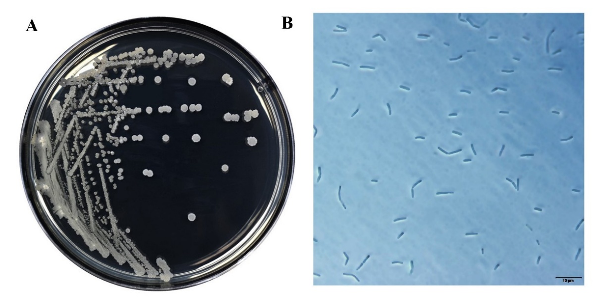 Figure 3 Morphological characteristics on tryptic soy agar at 37 °C for 18 h. (A), cell shape under phase-contrast microscopy at 1,000x magnification (B) of the bacterial isolate SNRUSA9.