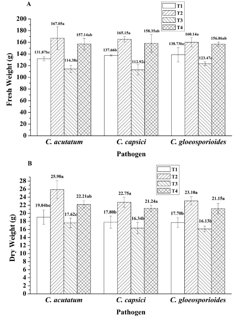 In evaluating the efficacy of Bacillus sp. SNRUSA9 in controlling anthracnose caused by C. acutatum, C. capsici, and C. gloeosporioides, as well as in promoting chili growth under pot experiment conditions, it was observed that a 60 days after transplanting, anthracnose symptoms occurred in all treatments, including those uninoculated with the pathogens. Disease development in Treatment 1 (T1) and Treatment 2 (T2) may be attributed to the open-pot experiment, which lacked contamination control measures. The planting period coincided with the winter season. In the early morning, there is fog and dew on the plant leaves, creating an environment conducive to the occurrence of fungal pathogens [31]. All three fungal species can produce asexual spores (conidia), which are easily dispersed by wind. The environmental conditions during the experiment, with an average temperature of 25.35 °C and high relative humidity of 72.9%, may have favored fungal growth and increased pathogenicity [32]. In Treatment 3 (T3), which was inoculated only with pathogenic fungi without the biocontrol agent, the highest disease incidences were observed: 98.31% in the C. acutatum trial, 92.08% in the C. capsici trial, and 87.41% in the C. gloeosporioides trial. In contrast, Treatment 4 (T4), which received Bacillus sp. SNRUSA9, showed significantly lower disease incidences (p < 0.05), with values of 17.15%, 26.48% and 30.37% in the respective trials (Figure 5). The reduction in disease incidence may be attributed to the antagonistic mechanisms of Bacillus sp. SNRUSA9, which can compete with pathogenic fungi for nutrients and space through siderophore production and biofilm formation, as well as the secretion of antimicrobial compounds such as extracellular lytic enzymes. In addition to its ability to suppress disease, Bacillus sp. SNRUSA9 significantly promoted the growth of chili plants (p < 0.05), as demonstrated in (Figures 6 and 7). Chili plants treated with Bacillus sp. SNRUSA9 showed higher average fresh weight (Figure 6(A)), average dry weight (Figure 6(B)), and average shoot length (Figure 7(A)) compared to those that did not receive the Bacillus sp. SNRUSA9 treatment.