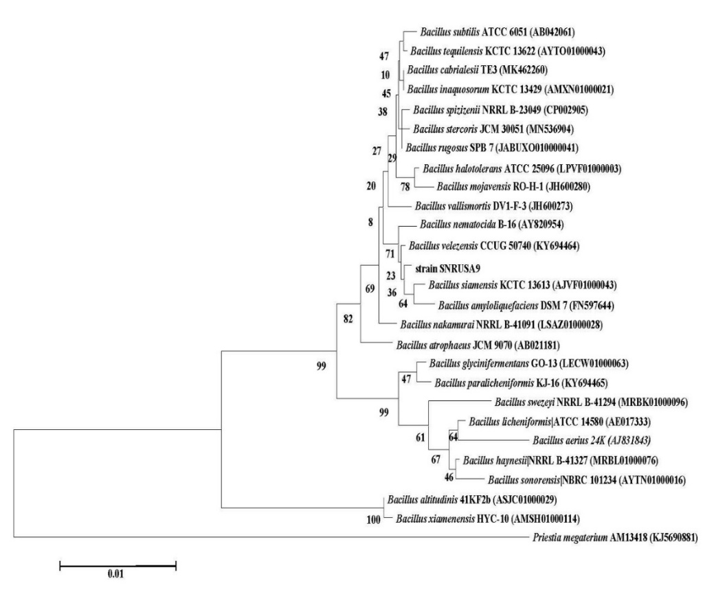 Figure 4 Neighbor-joining tree based on 16S rRNA gene sequences showing the phylogenetic relationships of bacterial isolate SNRUSA9 and related Bacillus species. Bootstrap values were calculated from 1,000 replications.