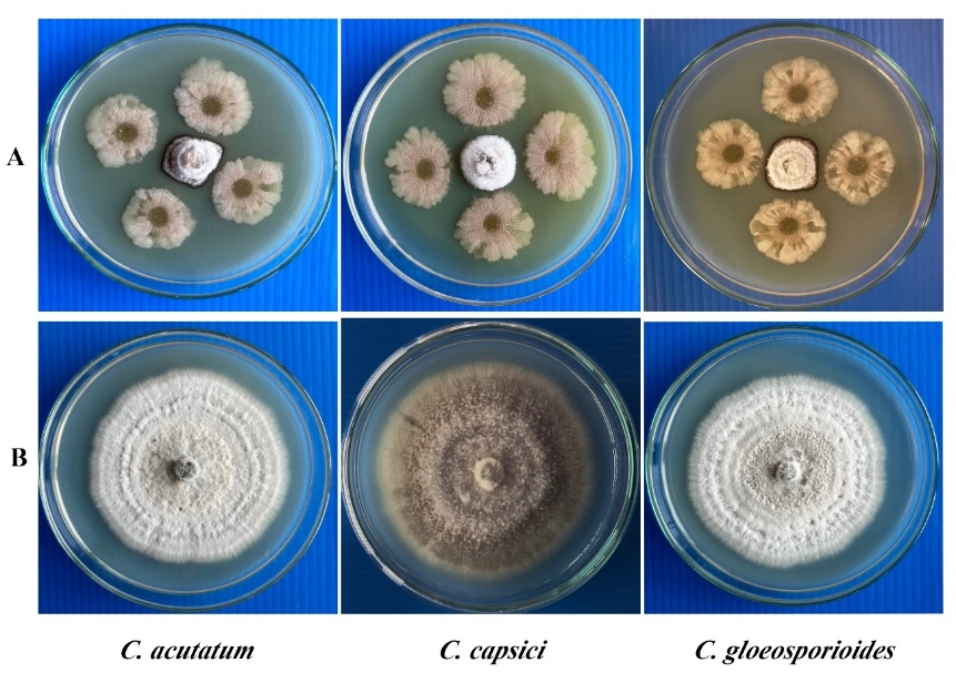 Figure 1 Efficiency of the bacterial isolate SNRUSA9 against C. acutatum, C. capsici, and C. gloeosporioides (A), and the untreated control group (B).