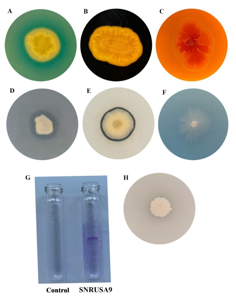 Figure 2 Potential biocontrol and plant growth-promoting properties of the bacterial isolate SNRUSA9 include siderophore production (A), amylase (B), cellulase (C), lipase (D), protease (E), chitinase (F), biofilm formation (G), and phosphate solubilization (H).