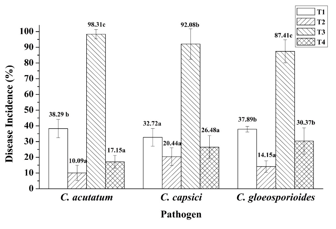 Figure 5 Percentage of disease incidence after treatment with Bacillus sp. SNRUSA9 and C. acutatum, C. capsici, and C. gloeosporioides, under pot experiment conditions for 60 days. The different lower-case letters indicate significant differences (p < 0.05) based on Tukey’s HSD test.