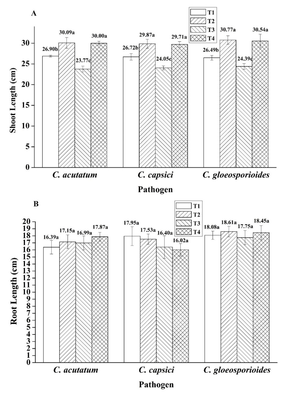 Figure 7 Plant growth promotion: Shoot length (A), root length (B) after treatment with Bacillus sp. SNRUSA9 and three Colletotrichum species under pot experiment conditions for 60 days. The different lower-case letters indicate significant differences (p < 0.05) based on Tukey’s HSD test.