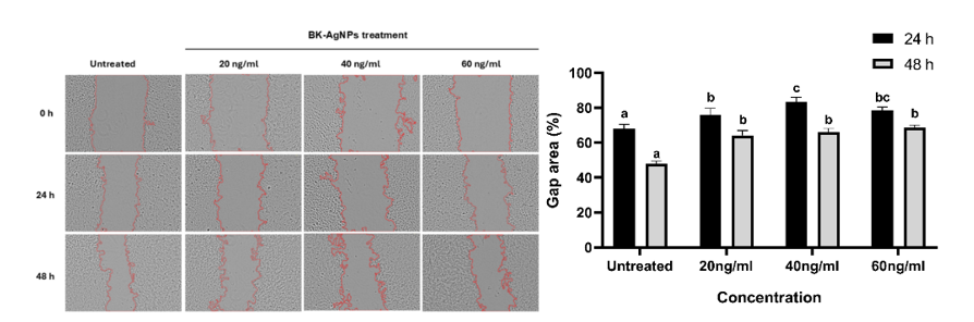 Figure 3 BK-AgNPs inhibit the migratory ability of HeLa cells compared to the untreated group, indicated by the gap area at 0, 24 and 48 h (p ≤ 0.05).