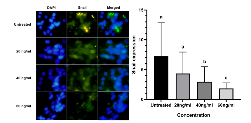Figure 5 Lower expression of Snail in the BK-AgNPs-treated groups compared to the untreated group based on the immunofluorescence assay (p ≤ 0.05).