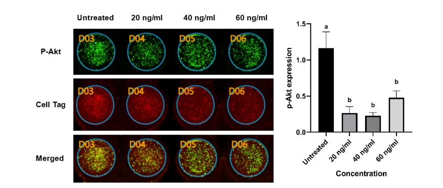 Figure 4 Lower expression of p-Akt in the BK-AgNPs-treated groups compared to the untreated group based on the ICW assay (p ≤ 0.05).