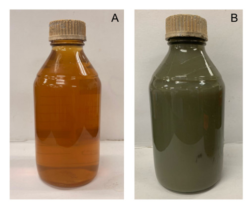 Figure 1 Change of color in the BK-AgNPs. (A) at 0 h, (B) after incubation for 24 h.