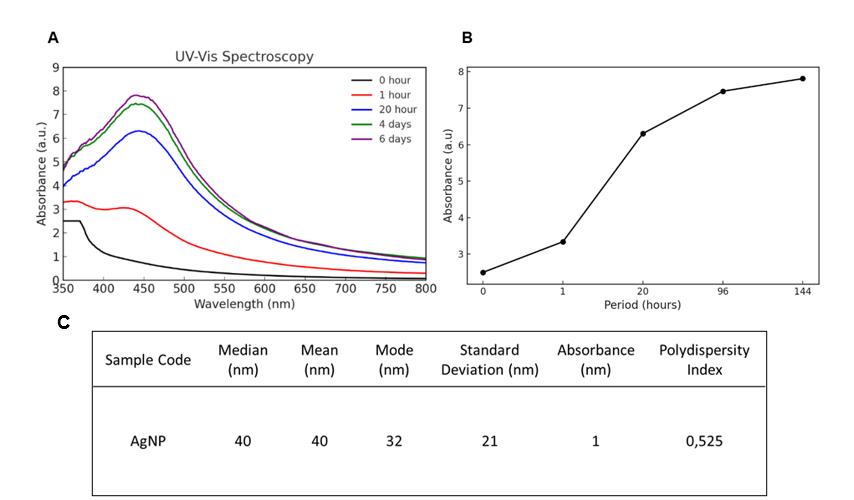 Figure 2 B. kockiana plant extract successfully synthesizes AgNPs. (A) UV-Vis spectroscopy results yielding a peak each day of observation, (B) increases in absorbance units of UV-Vis spectroscopy, (C) AgNPs detected with appropriate size and polydispersity index.