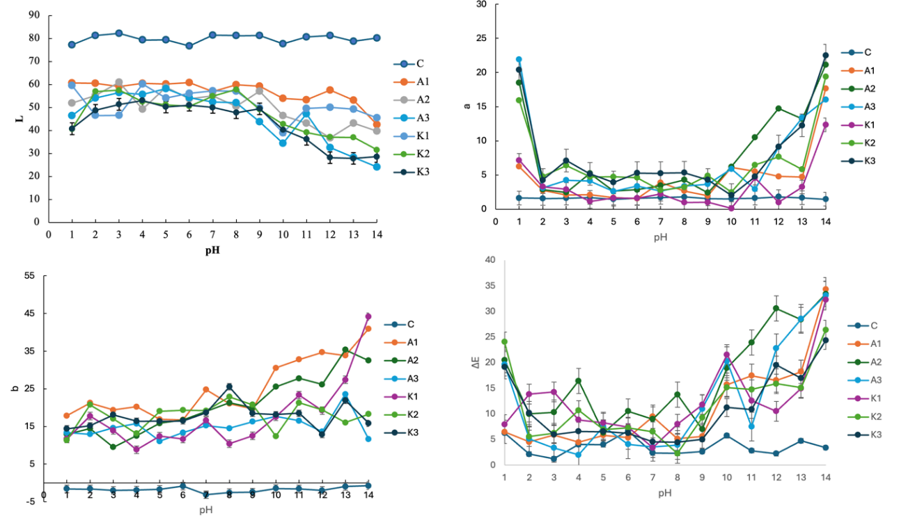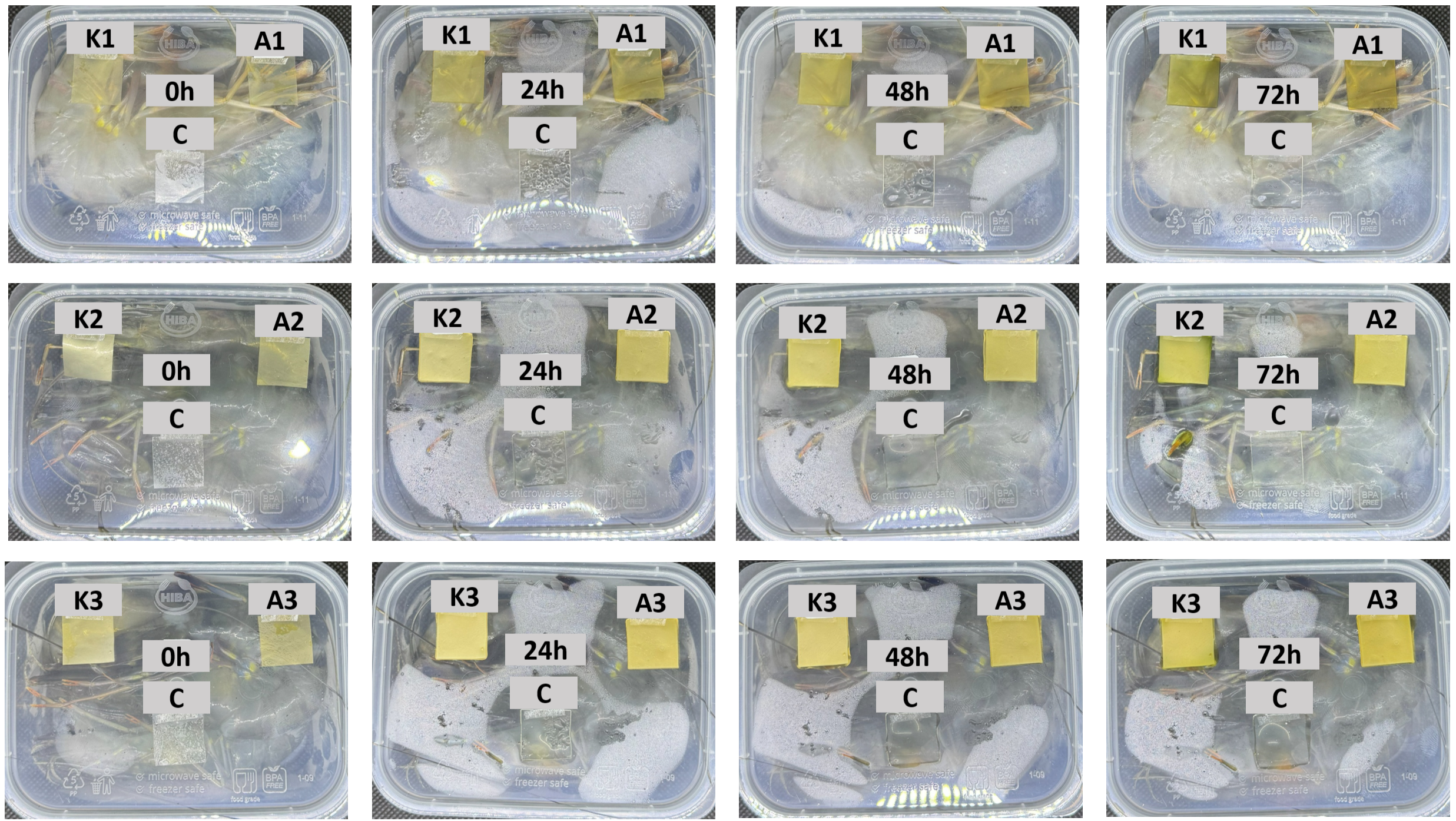 Accordingly, the glucomannan-gelatin films loaded with RPAE exhibited a yellow-to-green transition over time with ΔE > 5, reflecting the pH-dependent structural interconversion of anthocyanins from flavylium to quinoidal and ultimately to chalcone within the biopolymer matrix (Figure 5). This pH-dependent behavior highlights the molecular basis of anthocyanin sensitivity, enabling their application in intelligent packaging systems designed for freshness monitoring [32,33]. Such materials leverage the colorimetric potential of anthocyanins to visually indicate shifts in pH that correlate with food spoilage processes, thus offering a non-invasive means of assessing food quality [33]. Studies have demonstrated that the structural integrity and environmental conditions can significantly influence the stability and colorimetric properties of anthocyanins, solidifying their role as effective bioindicators in smart food packaging technologies [34,35]. Similar abediindicator behavior color shifts that track increases in TVB-N/TVC has been reported for chitosan and gelatin-based anthocyanin films, where hydrogen-bonding interactions help sharpen the sensing signal [33,48-50]. Collectively, these parallel changes in TVB-N, TVC, and ΔE demonstrate that the developed films provide a reliable, non-invasive indicator of shrimp freshness suitable for intelligent packaging applications.
