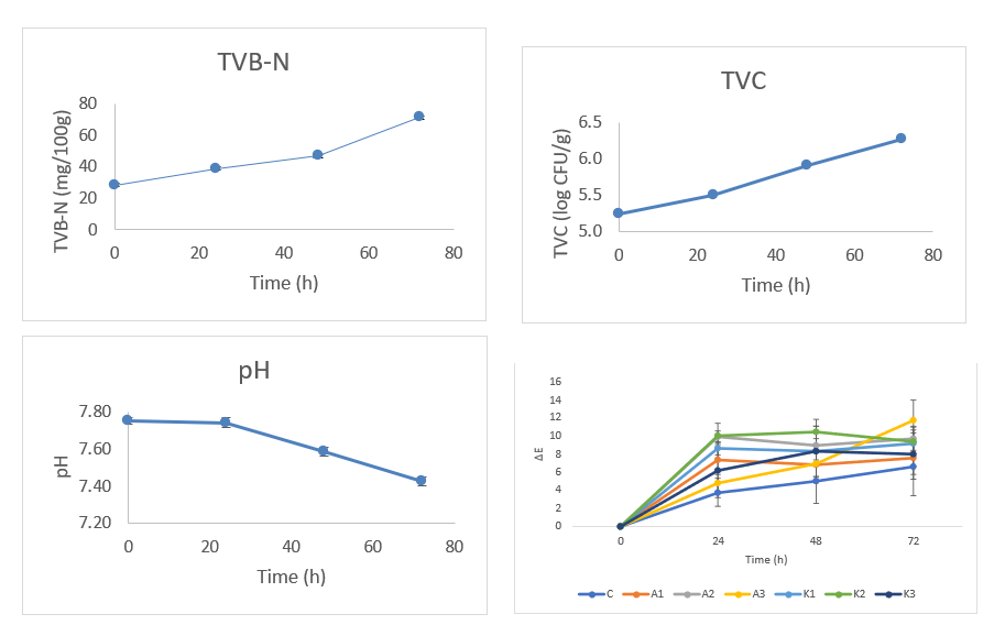 Figure 5 TVB-N, TVC, pH shrimp, and ΔE film.