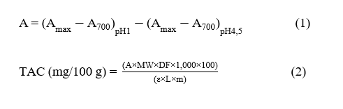 Total anthocyanin Content (TAC) analysis was performed using the pH differential method [23,26]. RPAE was diluted 25-fold with methanol PA. A 1 mL solution was taken and added to 4 mL of pH 1 buffer to obtain a total volume of 5 mL. The same procedure was repeated using a pH 4.5 buffer and homogenized using a vortex (Thermo Scientific MaxiMix™ II, Thermo Fisher Scientific Inc., Waltham, MA, USA). Measurements were made using a spectrophotometer (Thermo Scientific Genesys 10S UV-Vis, Germany). Absorbance readings were recorded at 520 and 700 nm, using distilled water as a calibration blank. The difference in absorbance between the pH values and wavelengths was calculated using the formula: