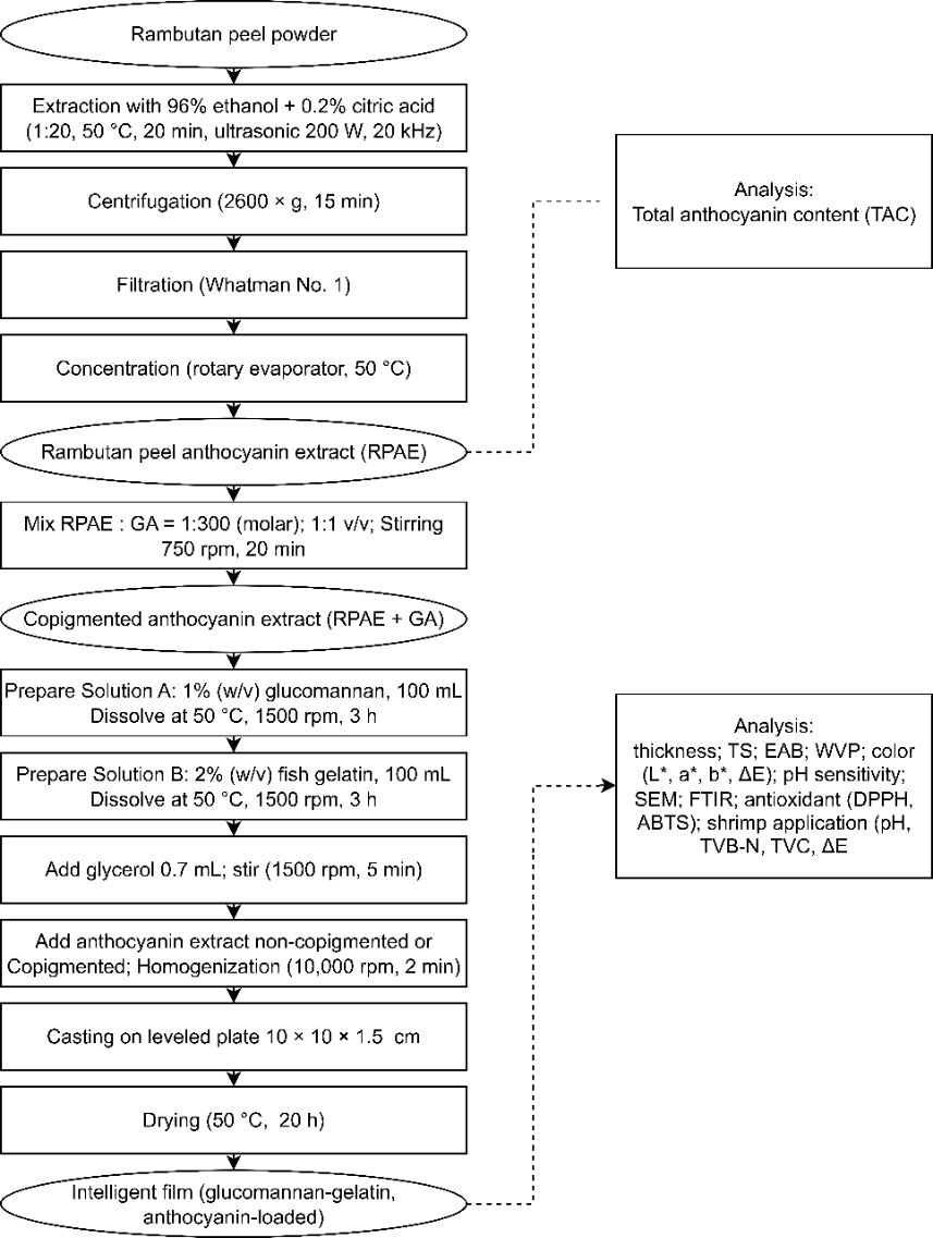 Therefore, this study aims to develop and characterize intelligent films based on porang (Amorphophallus oncophyllus) glucomannan and gelatin incorporated with copigmented RPAE for monitoring shrimp freshness. The integration of these natural components is expected to enhance film functionality, mechanical integrity, and color stability, enabling real-time freshness monitoring of shrimp through pH-dependent color transitions. This approach highlights the novelty of utilizing locally abundant rambutan peel waste and porang-derived biopolymers to produce sustainable, biodegradable, and intelligent food packaging materials.