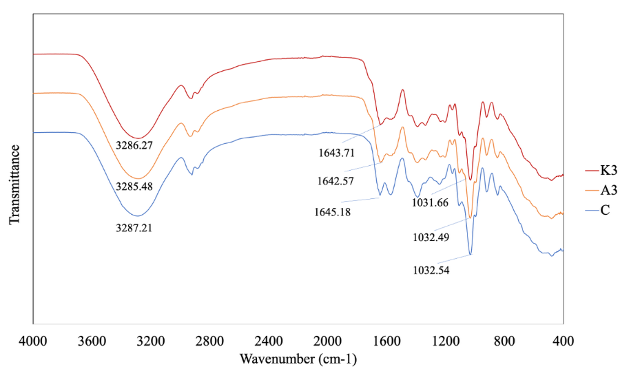 Figure 4 FTIR of intelligent packaging to pH. C = control film, A = film added with non copigmented anthocyanin, K = film added with copigmented anthocyanin.
