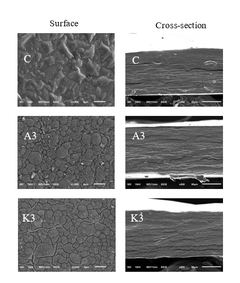 The morphology of intelligent films formed from gelatin and glucomannan, particularly those enriched with anthocyanins, can be effectively characterized using Scanning SEM. The SEM analysis provides insights into the structural attributes and surface characteristics of these films, which are critical for their application in food packaging. As shown in Figure 3, the incorporation of copigmented RPAE into glucomannan-gelatin films (K3) improved the surface morphology by producing a smoother and more homogeneous structure, while also reducing cracks observed in the cross-section. This indicates improved polymer compatibility and structural integrity, likely resulting from hydrogen bonding and electrostatic interactions among glucomannan, gelatin, and anthocyanins. The hydroxyl and phenolic groups of glucomannan and anthocyanins can form intermolecular hydrogen bonds with the amine and carbonyl groups of gelatin, leading to a more compact and homogeneous microstructure with fewer voids. Such a dense and uniform structure is generally correlated with higher TS and lower Water Vapor Permeability (WVP), as reported in recent studies on hydrogen-bonded biopolymer blends [3]. These molecular interactions collectively contribute to the development of high-performance intelligent films with enhanced mechanical and barrier properties. These findings are consistent with previous studies, where anthocyanin incorporation similarly influenced the morphology and performance of biopolymer-based films.