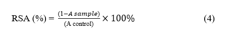 Several studies have demonstrated that the incorporation of anthocyanins into biopolymer films enhances their antioxidant potential. For instance, loading Clitoria ternatea anthocyanin-rich extract into sodium alginate films increased TPC and TAC, resulting in higher ABTS and DPPH activities [38]. Similarly, red cabbage anthocyanin extract significantly improved the DPPH scavenging activity of modified starch-based films [39], while black rice anthocyanins in pectin-chitosan films exhibited stronger antioxidant capacity than ascorbic acid. In line with these findings, RPAE incorporated into pectin-chitosan films markedly enhanced DPPH RSA (95.54%), attributed to their high phenolic content (3,439.63 mg/100 g) [23].
