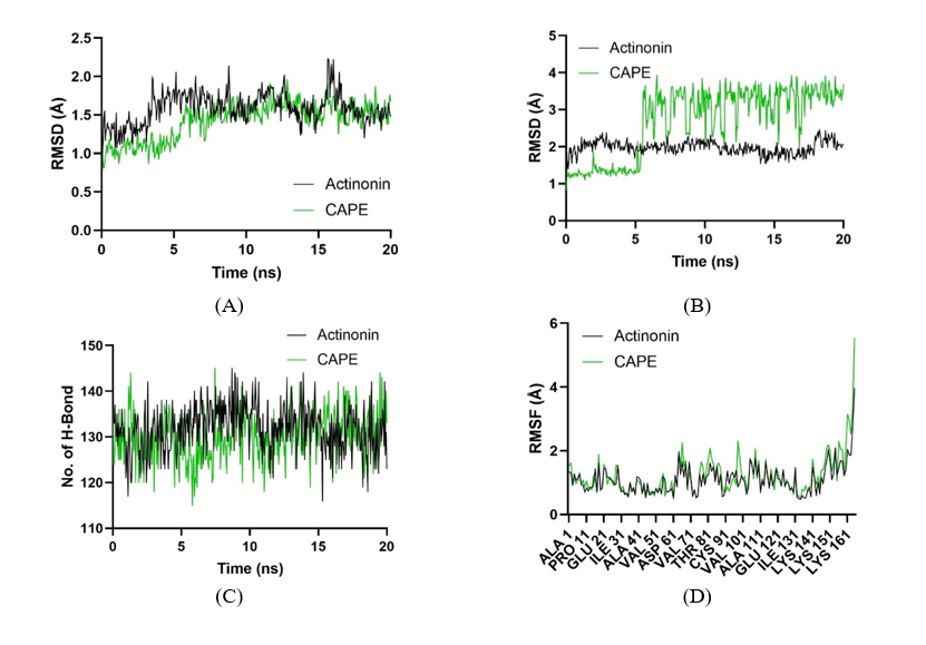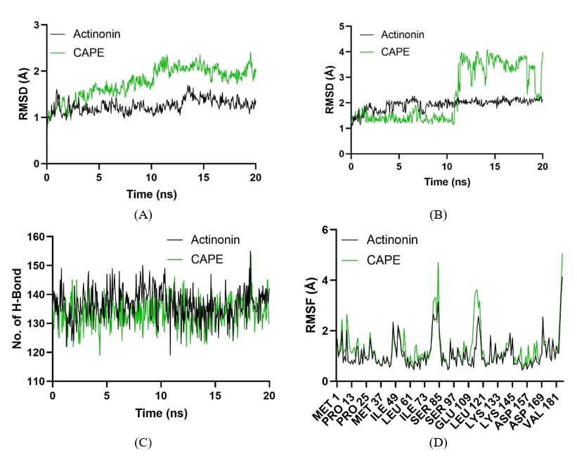 The molecular dynamics analysis of Peptide Deformylase from Staphylococcus aureus in complex with Actinonin and CAPE provides a comparative view of their binding stability and dynamic behavior during the simulation. Figure 8(A) displays the RMSD (Root-Mean-Square Deviation) of the protein backbone atoms. Actinonin shows a more stable profile with consistently lower RMSD values, indicating its superior ability to maintain the protein structure’s integrity. Conversely, CAPE demonstrates higher RMSD values, suggesting greater conformational shifts and reduced stability of the protein when bound to this ligand. Figure 8(B) shows the RMSD of ligand conformations during the simulation. Actinonin exhibits minimal deviations, reflecting a steady and well-maintained interaction within the binding pocket. In contrast, CAPE shows significant fluctuations, particularly after 10 ns, indicating its less stable binding mode and higher conformational flexibility. Figure 8(C) illustrates the number of hydrogen bonds formed between the protein and the ligands throughout the simulation. While both ligands maintain comparable hydrogen bond interactions, Actinonin displays a slightly more stable count, suggesting stronger intermolecular bonding compared to CAPE. Figure 8(D) presents the RMSF (Root-Mean-Square Fluctuations) per residue, highlighting residue-level dynamics. The Actinonin-bound complex shows relatively low fluctuations across most residues, indicating restricted flexibility and tighter binding. CAPE, however, causes increased residue-level fluctuations, particularly near the binding site, reflecting a more dynamic and less stable interaction.