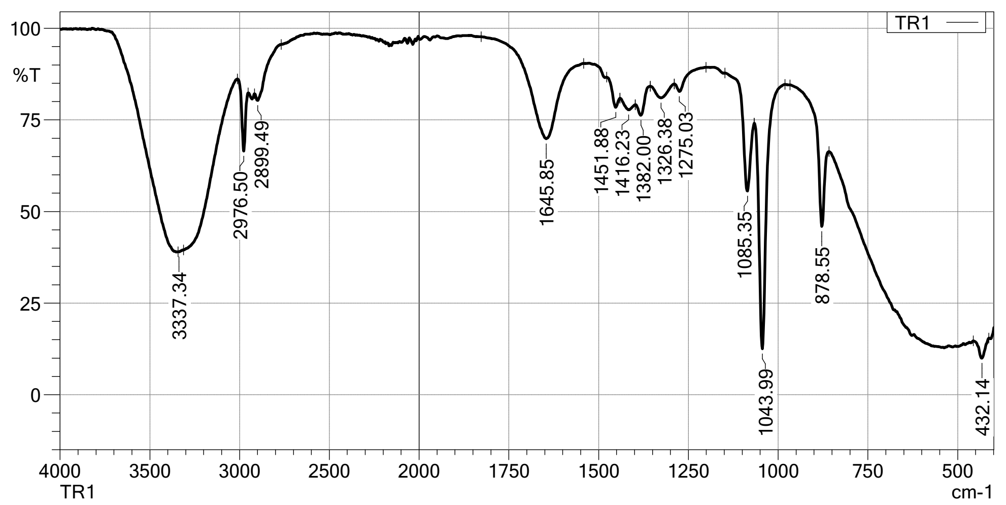 FTIR spectra provided crucial insights into the chemical interactions and successful encapsulation of CAPE. The spectrum of isolated CAPE showed characteristic absorption bands at 1,681 cm⁻¹ (C=O stretch of ester), 1,600 cm⁻¹ (aromatic C=C stretch), 3,471 and 3,320 cm⁻¹ (O-H stretch). The spectrum of blank nanoparticles exhibited typical peaks corresponding to the encapsulating polymer chitosan: ~1,750 cm⁻¹ (C=O ester), 2,976 and 2,899 cm⁻¹ (C-H stretch)) shows in Figure 3. In the spectrum of CAPE-loaded nanoparticles, the characteristic peaks of CAPE were observed, albeit with slight shifts or broadening, indicating successful encapsulation and potential interactions between CAPE and the polymer matrix. For instance, the provided spectrum of CAPE-loaded nanoparticles shows a broad O-H stretch at 3,337.34 cm⁻¹, C-H stretches at 2,976.50 and 2,899.49 cm⁻¹, and a prominent peak at 1,645.85 cm⁻¹ which can be attributed to a mix of CAPE’s C=O and C=C vibrations, shifted due to interaction with the polymer. No new significant peaks were observed, suggesting the absence of new chemical bonds formed during the encapsulation process, thus preserving the chemical integrity of CAPE.
