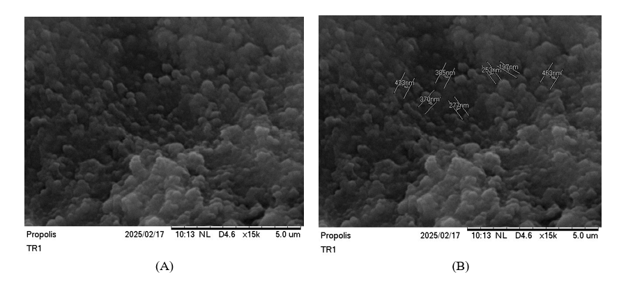 Propolis nanoencapsulates were synthesized using an ionic gelation method. First, a 20% propolis extract was dissolved into a 0.32% chitosan solution (in 2% acetic acid) under continuous magnetic stirring. The resulting mixture was filtered through a 0.22 µm MCE membrane filter. Subsequently, a 0.4% sodium tripolyphosphate (TPP) solution was added dropwise to the propolis-chitosan mixture to act as a cross-linking agent, inducing the formation of nanoparticles. The resulting suspension was then subjected to ultrasonication to reduce particle size and ensure homogeneity.