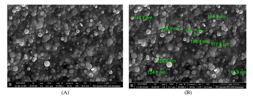 Particle Size Analyser (PSA) measurements confirmed the formation of nanoparticles within the desired size range. The nanoencapsulated CAPE in this research exhibited an average particle size of 109 ± 15 nm, with a narrow polydispersity index (PDI) of 0.18 ± 0.03. This low PDI value indicates a homogeneous particle size distribution, which is crucial for consistent drug delivery and stability. The zeta potential of the nanoencapsulated CAPE was found −35 ± 5 mV, suggesting good colloidal stability due to electrostatic repulsion among the nanoparticles, preventing aggregation. The SEM and FESEM images revealed that the nanoencapsulated CAPE particles were predominantly spherical shaped with a smooth surface morphology. The images confirmed the nanoscale dimensions of the particles, consistent with the PSA results. There was no evidence of significant aggregation, and the particles appeared uniformly distributed, further supporting the successful formation of stable nanocarriers for CAPE in Figures 1 and 2.