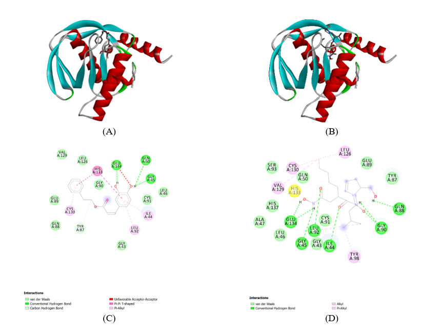 Figure 6(C) shows the atomic-level interactions between CAPE and the 1LRY protein. It illustrates specific amino acid residues involved in binding and the types of interactions formed. This indicates Van der Waals (light green circles): Non-specific, short-range attractive forces that contribute significantly to overall binding affinity. Residues like VAL A:129, LEU A:126, GLU A:89, TYR A:87, GLN A:88, GLY A:43, LEU A:92, ILE A:44, GLY A:45, LEU A:46, GLN A:50, CYS A:91, CYS A:130, HIS A:133 are shown to be involved. Conventional Hydrogen Bond (green dashed lines): Specific, directional interactions between a hydrogen atom covalently bonded to a more electronegative atom and another electronegative atom. The diagram shows hydrogen bonds between the hydroxyl groups of CAPE and GLU A:134, GLN A:50. This is a crucial interaction for the binding affinity and specificity of CAPE. Carbon Hydrogen Bond (light green dashed lines): This indicates a specific type of hydrogen bond involving a carbon atom. Pi-Pi T-shaped (pink dashed lines): A specific type of aromatic interaction. The diagram shows Pi-Pi T-shaped interactions with HIS A:133, CYS A:130, LEU A:126, TYR A:87, LEU A:92. These interactions contribute to the stabilization of the aromatic rings of CAPE within the active site. Pi-Alkyl (pink dashed lines): Hydrophobic interactions involving aromatic rings and aliphatic groups. Residues like CYS A:130, LEU A:126, TYR A:87, LEU A:92 are shown to have Pi-Alkyl interactions with the aromatic rings of CAPE. These interactions stabilize the ligand within the hydrophobic pockets of the active site. Unfavorable Acceptor-Acceptor (red dashed lines): This indicates an unfavorable interaction between 2 electron acceptors. The diagram shows an unfavorable interaction between CAPE and GLU A:134. This might suggest a slight repulsion or a less optimal orientation in this specific interaction point. Metal-coordinating residues/Chelation: The diagram does not explicitly show a metal ion or direct chelation by CAPE. This suggests that CAPE’s inhibitory mechanism might not primarily involve direct coordination to a metal ion in the active site, unlike some other PDF inhibitors. The carbonyl oxygen of CAPE is shown, but its direct interaction with a metal ion is not depicted.