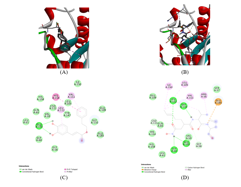 The atomic-level interactions between CAPE and the 1Q1Y protein shows in Figure 5(C), this amino acid residues involved in binding and the types of interactions formed. The legend indicates that Van der Waals (light green circles): Non-specific, short-range attractive forces that contribute significantly to overall binding affinity. Residues like GLN A:65, LEU A:61, GLY A:60, GLY A:58, GLU A:109, GLY A:110, ILE A:150, SER A:57, VAL A:59, CSD A:111, HIS A:158, HIS A:154, VAL A:151, LEU A:105, TYR A:147, LEU A:112 are shown to be involved. Conventional Hydrogen Bond (green dashed lines): Specific, directional interactions between a hydrogen atom covalently bonded to a more electronegative atom and another electronegative atom. The diagram shows hydrogen bonds between the hydroxyl groups of CAPE and GLU A:155. This is a crucial interaction for the binding affinity and specificity of CAPE. Pi-Alkyl (pink dashed lines): Hydrophobic interactions involving aromatic rings and aliphatic groups. Residues like HIS A:154, VAL A:151, LEU A:105, LEU A:112, TYR A:147 are shown to have Pi-Alkyl interactions with the aromatic rings of CAPE. These interactions stabilize the ligand within the hydrophobic pockets of the active site. Pi-Pi T-shaped (purple dashed lines): A specific type of aromatic interaction. This type of interaction is not explicitly shown in the legend but might be represented by a similar dashed line if present. Based on the diagram, there are no explicit Pi-Pi T-shaped interactions indicated. Metal-coordinating residues/Chelation: The diagram does not explicitly show a metal ion or direct chelation by CAPE. This suggests that CAPE’s inhibitory mechanism might not primarily involve direct coordination to a metal ion in the active site, unlike some other PDF inhibitors. The carbonyl oxygen of CAPE is shown, but its direct interaction with a metal ion is not depicted.