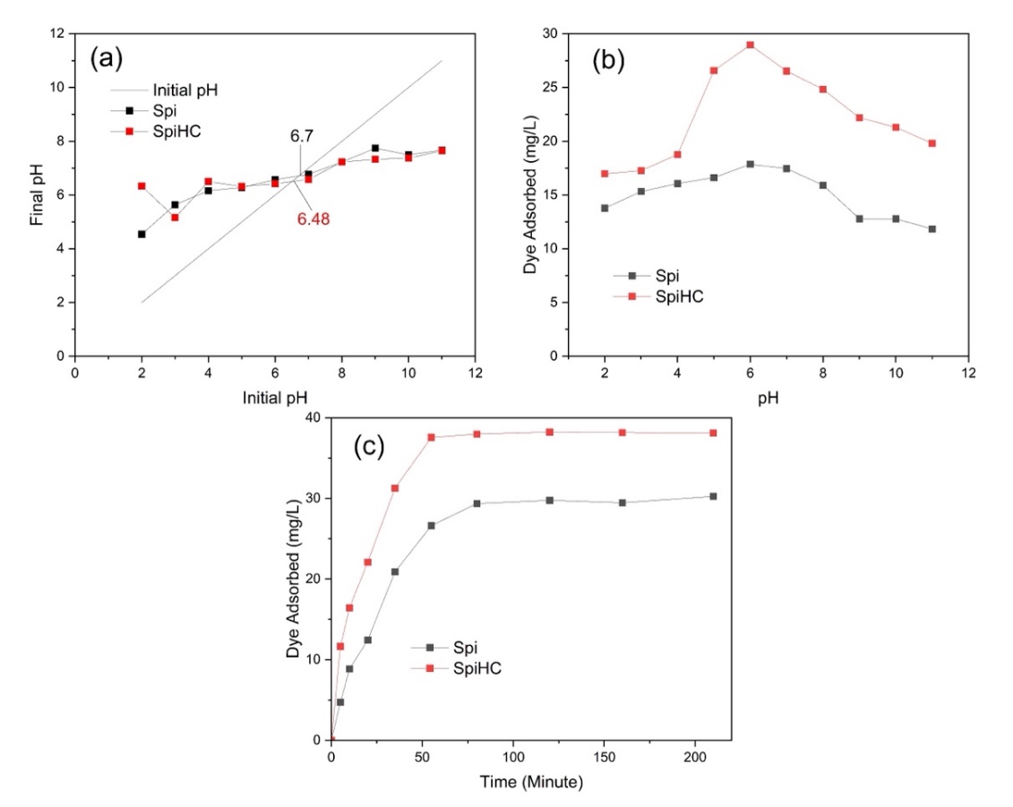 Figure 3 The pHpzc (a), pH Adsorption (b) and Time Adsorption (c) of Spi and SpiHC.