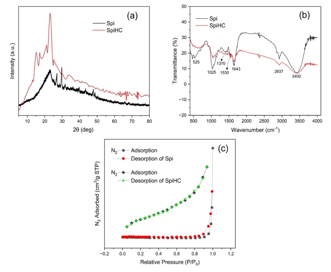 Figure 1 The XRD Pattern (a), FTIR Spectra (b) and BET N2 Adsorption-Desorption (c) of Spi and SpiHC.
