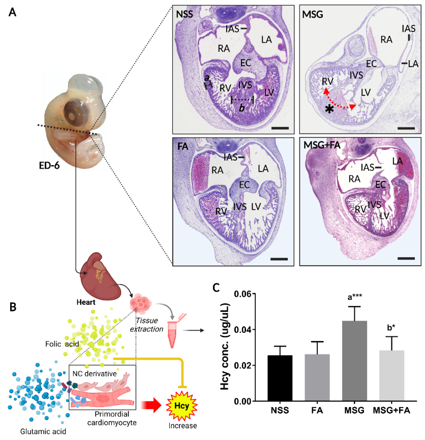 Figure 6 Illustrates histological sections comparing heart morphology between control and MSG exposure embryos at developmental stages of ED-6. (A) shows an overview of an ED-6 embryo, with the dashed line indicating the sectioning plane for the histological analysis. The transverse sections of the heart display in control, MSG, and FA treatment embryos, respectively. The control and FA treatment heart exhibits intact septation with typical structures, including the endocardial cushion (EC), interatrial septum (IAS), interventricular septum (IVS), left atrium (LA), right atrium (RA), left ventricle (LV), and right ventricle (RV). In the MSG group, septal defects are highlighted by red arrows, while an asterisk marks blood congestion in the LA. The heart wall thickness (“a”) and septum thickness (“b”) are denoted by dashed black lines. The control and FA treatment heart shows well-defined septa and standard wall thickness. In contrast, the MSG heart demonstrates disrupted septation (red arrows), reduced heart wall thickness and septum thickness. Furthermore, the schematic diagram (B) illustrates the homocysteine (Hcy) levels in heart tissues extracted from ED-6 chick embryos. The photograph shows heart tissue dissection for ELISA-based homocysteine determination. The figure depicts the proposed molecular mechanism of MSG-induced cardiovascular defects. MSG exposure increases systemic Hcy levels, as shown in the diagram. Elevated Hcy disrupts endothelial cell integrity, potentially contributing to cardiac malformations. In addition, FA treatment abrogates the adverse effect by reducing Hcy levels. All images were captured at 20× magnification, with a scale bar of 50 µm. The bar graph in (C) presents a comparative analysis of Hcy concentrations (µg/µL) between the control, MSG, and FA treatment groups, revealing a statistically significant increase in Hcy levels in the MSG group (*** = p-value < 0.005, * = p-value < 0.05).