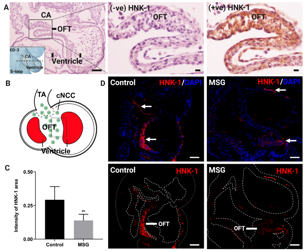 Figure 4 The diagram provides an overview of the investigation into cardiac neural crest cells (cNCC) and their role in heart development, mainly focusing on the cardiac outflow tract (OFT). (A) A dextrodorsal view of ED-3 chick embryos illustrating heart looping, which correlates with the subsequent tissue sections. Immunohistochemical staining identifies the presence of cNCCs on the OFT, providing evidence of their localization indicated by brown staining and highlighting the heart’s tissue, including the conus arteriosus (CA), cardiac outflow tract (OFT), and ventricles. This image provides anatomical context for understanding the spatial orientation of the heart during early development. (B) Illustrative diagrams depict the migration of cNCCs through the truncus arteriosus (TA) and into the OFT, showcasing their developmental trajectory. (C) A bar graph compares the intensity of cNCC markers between the control and experimental groups. The results indicate a significant increase in cNCC presence in the experimental groups (** = p < 0.01). (D) Sections are labeled with anti-HNK-1 for cNCCs and DAPI for nuclei. Clusters of cNCCs in the OFT are indicated by white arrows. The scale bar is 50 µM, and images are taken at 20× magnification. These comprehensive data provide insights into the distribution, migration, and quantitative changes in cNCCs during cardiac development, emphasizing their crucial role in forming the OFT.