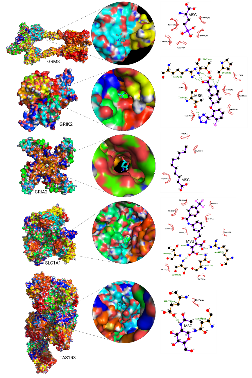 Figure 3 The image illustrates the outcomes of molecular docking analyses for MSG interacting with specific biomolecular targets named GRM8, GRIK2, GRIA2, SLC1A1, and TAS1R3.