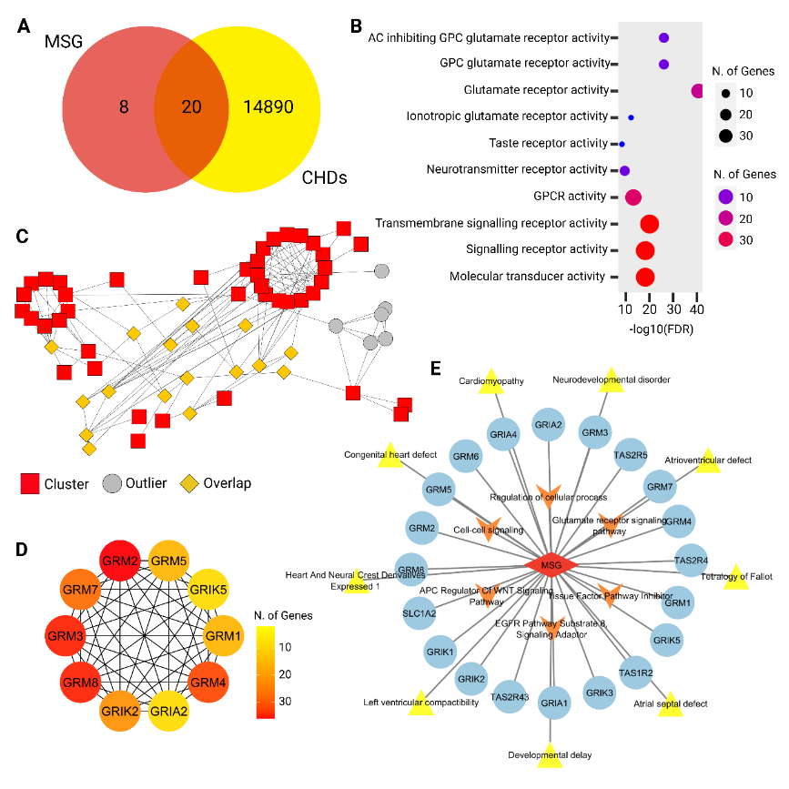 In conclusion, this study provides novel insights into the mechanistic connections between MSG exposure and CHDs through shared molecular pathways and functional networks. These results highlight the need for further experimental validation and exploration of the role of the identified signaling pathways in CHD pathogenesis. This may then open avenues for targeted interventions and improved understanding of environmental contributions to congenital disorders.
